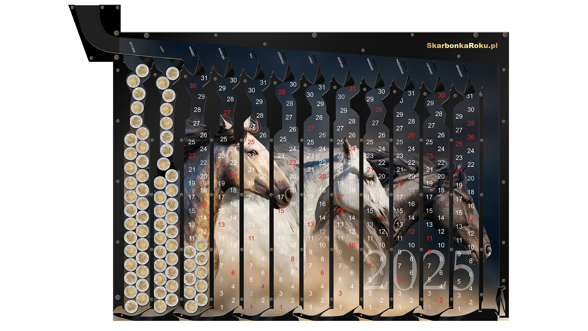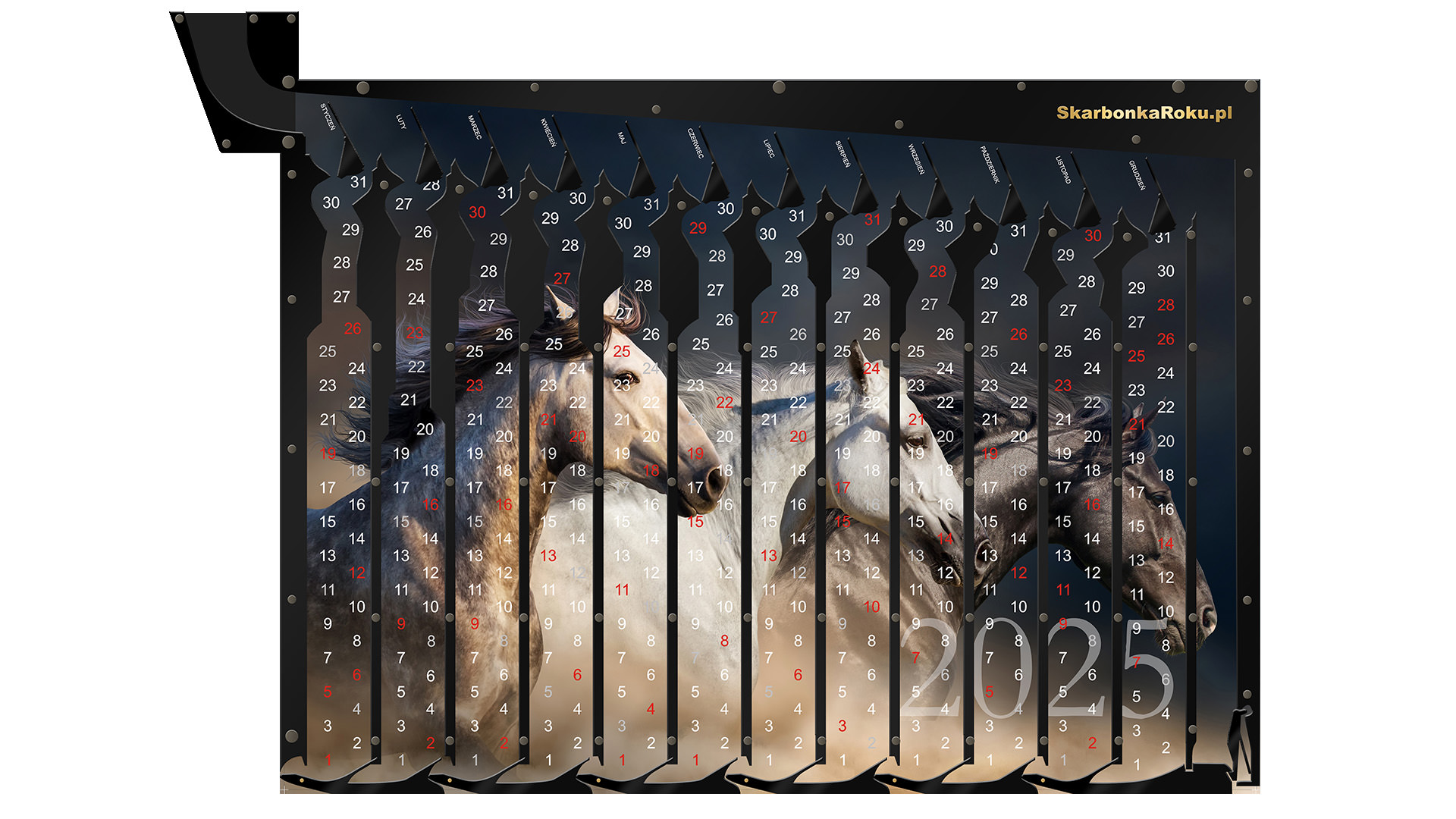 ➡️ Skarbonka w formie kalendarza Kalendarz 2025 Konie z cyferkami będzie nam przypominać kiedy wrzuciliśmy ostatnią monetę,