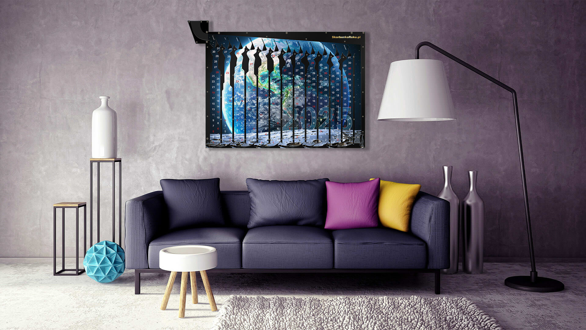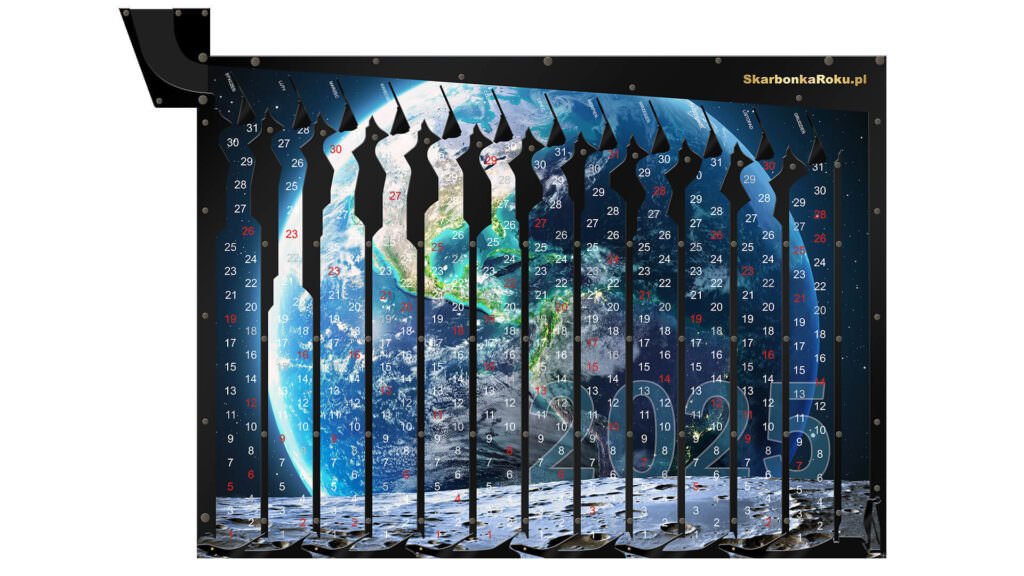 Kalendarz 2025 Kula Ziemska jest to nasza propozycja na piękną skarbonkę z widokiem naszej planety widzianej z księżyca. Wzór kalendarza z cyferkami będzie pasował wszędzie i sprawdzi się jako prezent dla każdego. Istnieje możliwość dokupienia na naszej stronie samego plakatu kalendarza na następne lata, a wymiana tła jest bardzo prosta – wystarczy odkręcić kilka śrubek z tyłu.