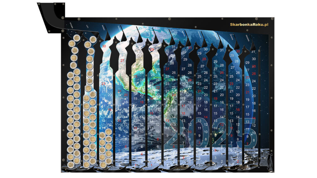 ➡️ Skarbonka w formie kalendarza Kalendarz 2025 Kula Ziemska z cyferkami będzie nam przypominać kiedy wrzuciliśmy ostatnią monetę,