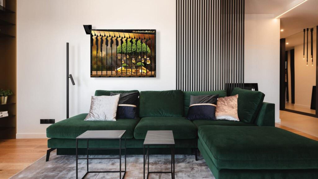 Skarbonka powieszona na ścianie wygląda bardzo atrakcyjnie i śmiało może zostać elementem dekoracyjnym.