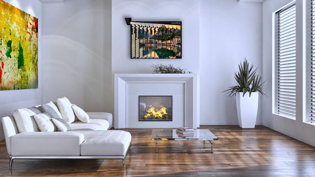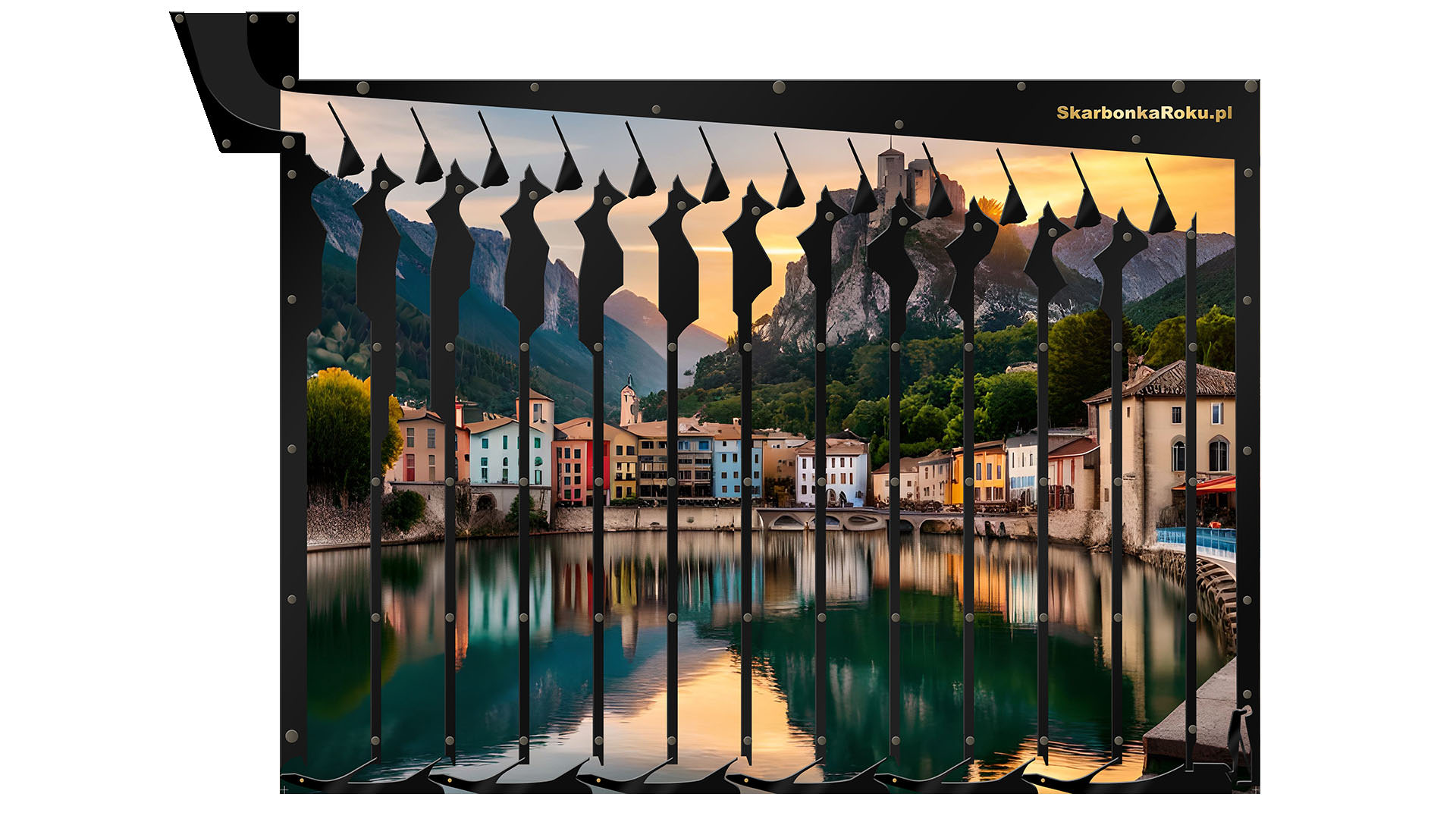 Skarbonka Miasto Nad Jeziorem z krajobrazem nad jeziorem Como może spełniać funkcje obrazu i być motywacją oszczędzania, dlatego Skarbonka Miasto Nad Jeziorem to idealny pomysł na prezent.